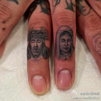 手指小巧经典的耶稣与圣母肖像纹身图案