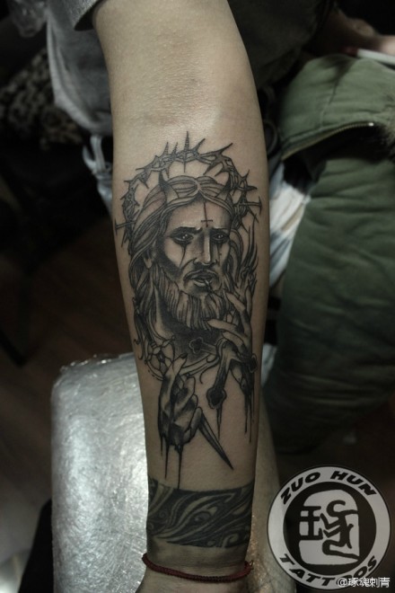 手臂时尚很酷的一款耶稣肖像纹身图案