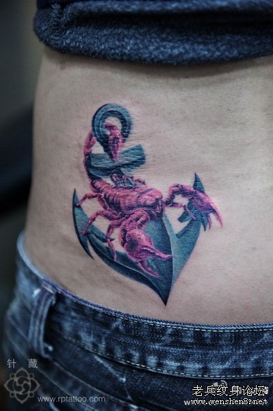 腰部彩色蝎子铁锚纹身图案纹身图片