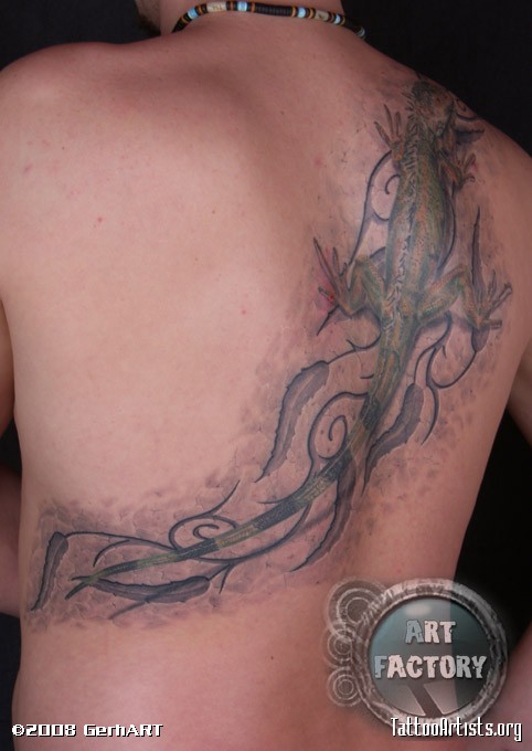 武汉纹身:后背烙印藤条蜥蜴纹身图案图片