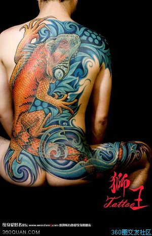 湖北武汉专业纹身店:满背彩色蜥蜴纹身图案图片