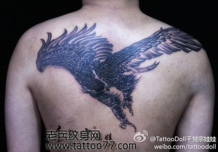 男人后背很酷时尚的黑灰老鹰纹身图案