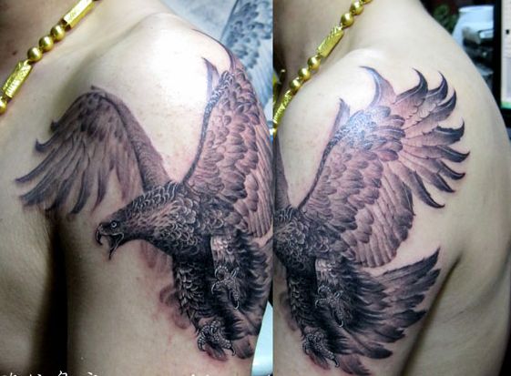 男人后背很酷时尚的黑灰老鹰纹身图案