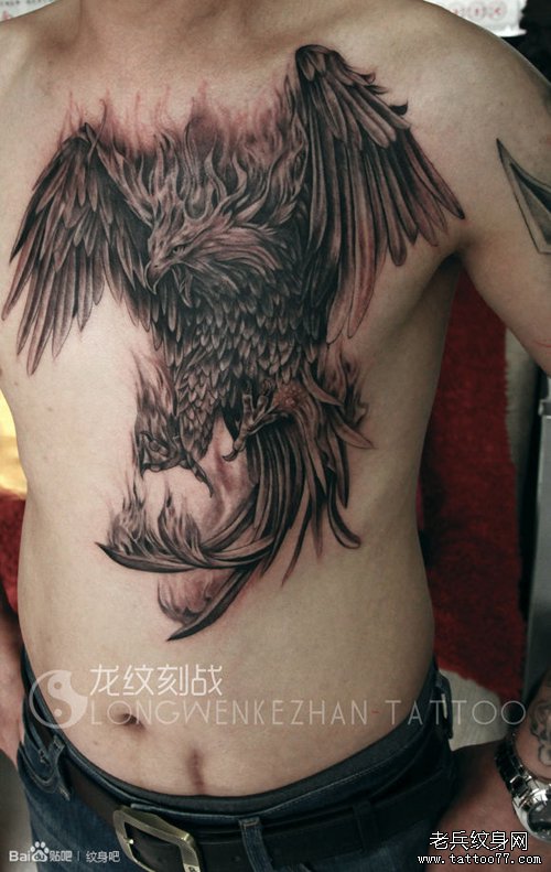 男人前胸超酷黑灰的老鹰纹身图案
