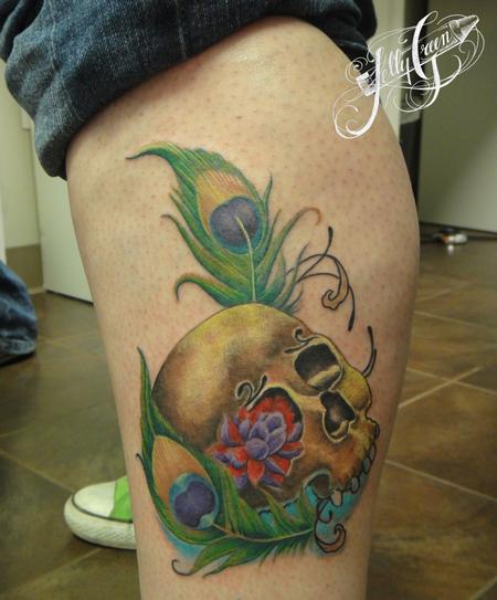武汉文身店:腿部超酷的一款骷髅羽毛文身图案大全