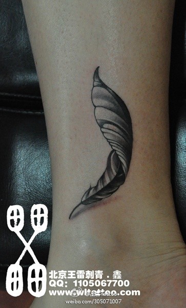 女生脚踝处小巧的羽毛纹身图案