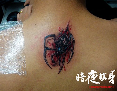 武汉纹身网:后颈部撕皮蜘蛛纹身图案图片
