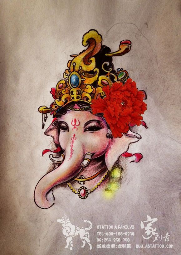 一款唯美流行的象神纹身图案