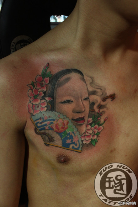 男人前胸经典帅气的面具纹身图案