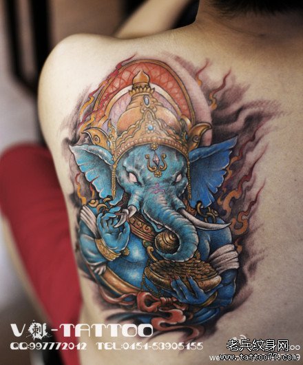 女生后背经典潮流的彩色象神纹身图案
