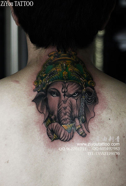 男生后背很酷经典的象神纹身图案