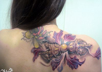 美女肩部彩色金刚杵花卉纹身图案大全