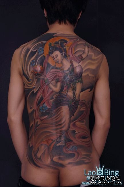 我们看到优美的飞天,就会想到敦煌莫高窟艺术,飞天是敦煌艺术的标志,是不朽的艺术品。纹身艺术中也引用了飞天这一民族的传统艺术,飞天纹身图被纹身师栩栩如生的纹刺在皮肤上,其美感不比敦煌壁画中的艺术形象逊色。