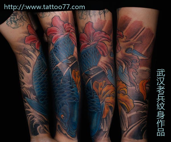 武汉专业纹身店:遮盖失败纹身--手臂鲤鱼百合花纹身图案