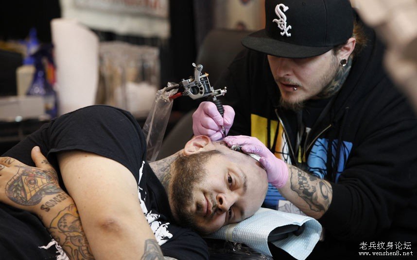 一位纹身师正在一位客户的头上纹身。今年举行的弗吉尼亚汉普顿罗德纹身节已经是第二年了。