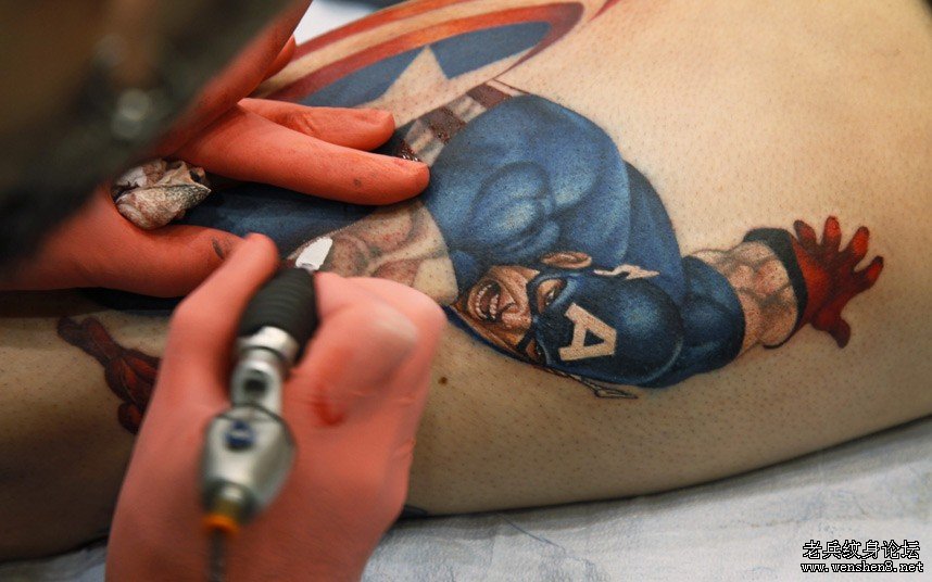 在弗吉尼亚举办的汉普顿罗德纹身节上,纹身师Sean Karn正在为Ron Raucci的腿部纹上一个“美国队长”的图案。这个“美国队长”的纹身仅仅需要五个半小时即可完成,而且赢下了当天的纹身比赛的一个奖项。