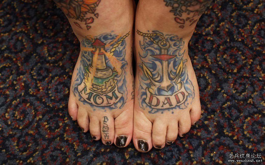 Keisha Holcomb展示脚背上印着“妈”和“爸”的纹身。这些图案是她在参加辛辛那提市的全国纹身协会大会时刚刚纹上去的。