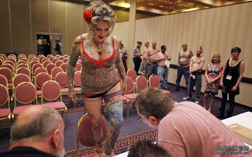 在附近参加展览会的一群妇女被吸引过来,她们“溜进”在俄亥俄州辛辛那提市举行的全国纹身协会大会,并对着一个浑身纹身的与会者一阵狂拍。