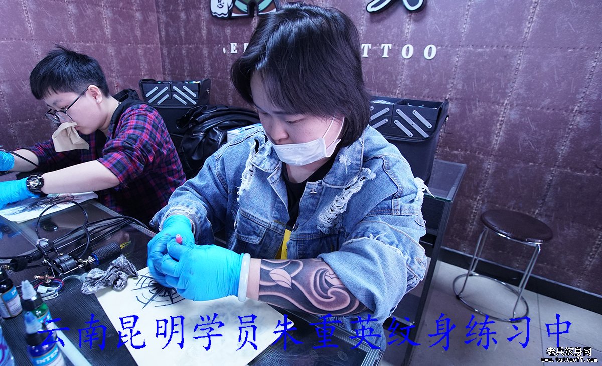 广西百色纹身学员黄苏丽纹身练习中