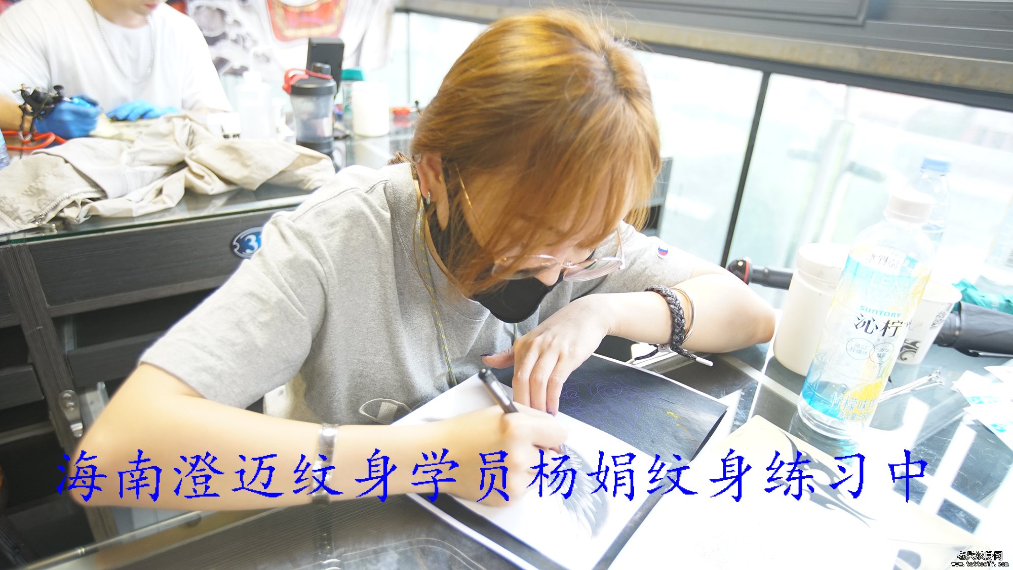 海南澄迈纹身学员杨娟纹身练习中