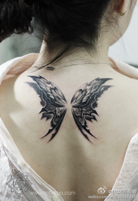 时尚精美的女生背部蝴蝶翅膀纹身图案
