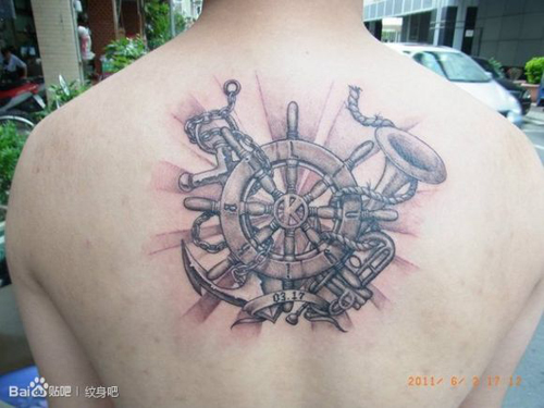 后背经典潮流的船舵纹身图案