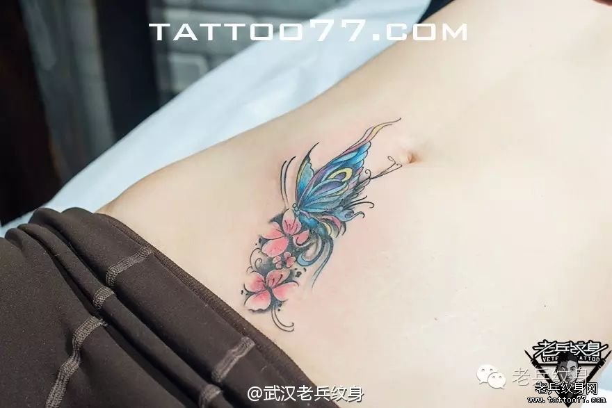 腹部蝴蝶花纹身图案