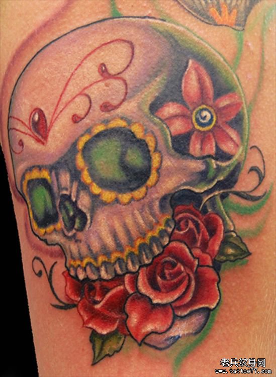 推荐一款骷髅玫瑰花纹身图案