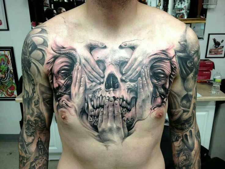 男人一款霸气十足的胸前骷髅纹身图案