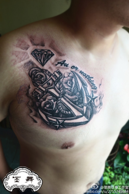 胸部潮流时尚的黑灰船锚纹身图案