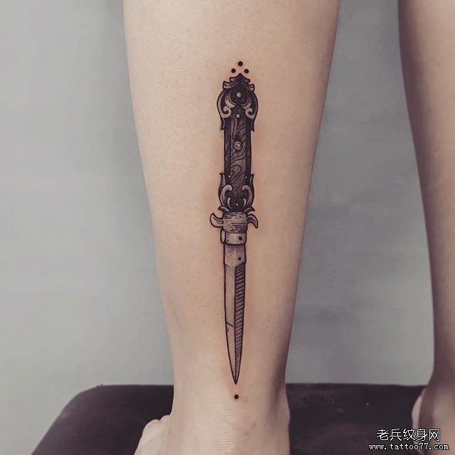 小腿黑灰匕首纹身图案