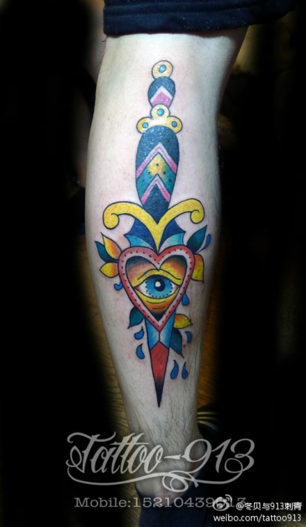 腿部时尚经典的一款匕首与眼睛纹身图案